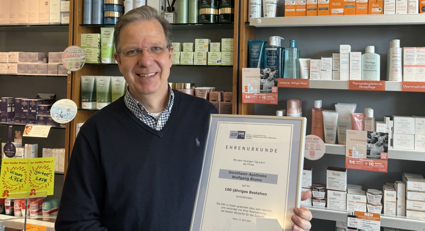 Im Schatten dieser Ereignisse eröffnete er im Februar 1924 die Dorotheen-Apotheke an der Rüttenscheider Straße 127. Heute, ein Jahrhundert später, steht Wolfgang Blume als Nachfolger von Klein an der Spitze dieser traditionsreichen Apotheke, die sich nun an der Rüttenscheider Straße 107 befindet. Anlässlich des 100-jährigen Bestehens lässt Blume gemeinsam mit seinem Team die bewegte Geschichte der Apotheke Revue passieren. Auch die IHK zu Essen gratuliert dem Unternehmen ganz herzlich zu dieser langen und spannenden unternehmerischen Geschichte. Wolfgang Blume, der natürlich vor 100 Jahren noch nicht auf der Welt war, hat sich dennoch intensiv mit der Geschichte seiner Apotheke auseinandergesetzt. Er hat in Archiven recherchiert und Unterlagen von seiner Vorgängerin Renate Zirvas erhalten, die ihm bei der Übergabe im Jahr 1996 übergeben wurden.