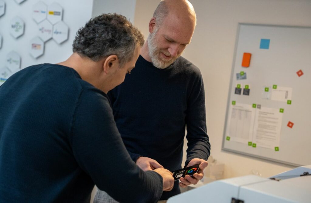 Viele kennen NFC-Chips nur von ihrer Bankkarte, dabei sind die Möglichkeiten fast endlos: Von der Zutrittskontrolle über die Inventarisierung bis hin zur Kundeninteraktion. Beispielsweise können Unternehmen mit NFC-basierten Zutrittskontrollsystemen den Zugang zu ihren Gebäuden effizienter und sicherer gestalten. „Im Wesentlichen geht es darum, dass man ein Produkt hat, das man mit dem Smartphone auslesen kann“, erklärt Werner Gaulke-Sedlak, einer der Geschäftsführer der NFC21 GmbH. „Der Anwender erhält digitale Informationen mit einem unsichtbaren Merkmal, das zusätzlich eine eindeutige, weltweit einzigartige Identifikationsnummer hat und keine guten Lichtverhältnisse braucht.“ In seinem Unternehmen sind in großen Vitrinen Beispiele für die Produkte der NFC21 GmbH ausgestellt: In Deckeln von Kosmetikprodukten werden