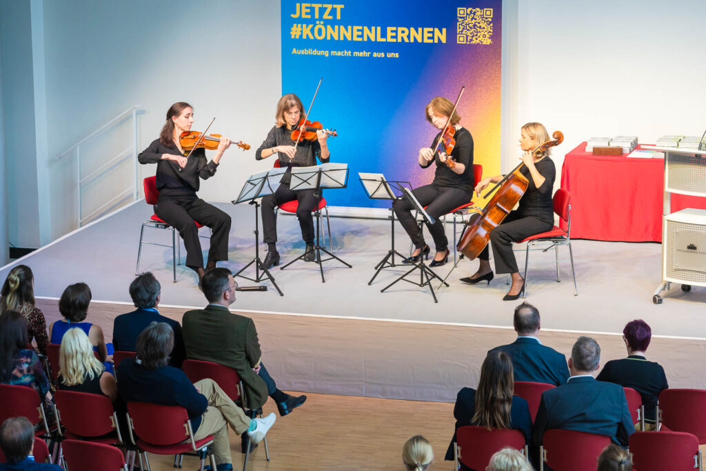 Etwa 100 Prüferinnen und Prüfer folgten der Einladung zur Prüferehrung in die Philharmonie Essen Conference Center. IHK-Vizepräsident Ralf Teichmann ehrte die Mitglieder der Prüfungsausschüsse für 10-, 20-, 25-, 30- und sogar 40-jähriges Engagement in den Prüfungsausschüssen der IHK. Passend dazu feiern die Essener Philharmoniker 125 Jahre Orchestergeschichte. Ein Streichquartett eröffnete die Feier musikalisch.