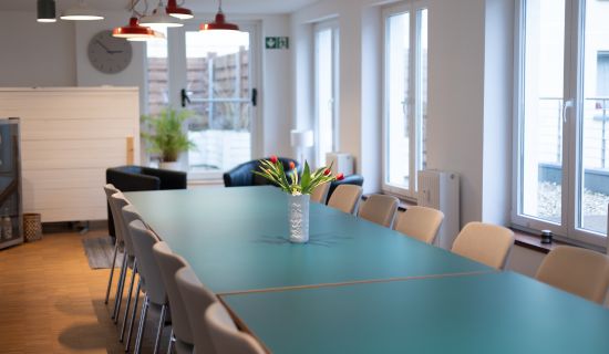 Im Alltag zeigt sich dieser Anspruch unter anderem durch den konsequenten Einsatz von Mehrwegsystemen im Haus. Fahrradstellplätze vor dem Gebäude sollen Nutzerinnen und Nutzern einen Anreiz geben, auf das Auto zu verzichten. Zudem steht vor Ort ein Fahrrad zur Verfügung, das man bei Bedarf in den Pausen nutzen kann.