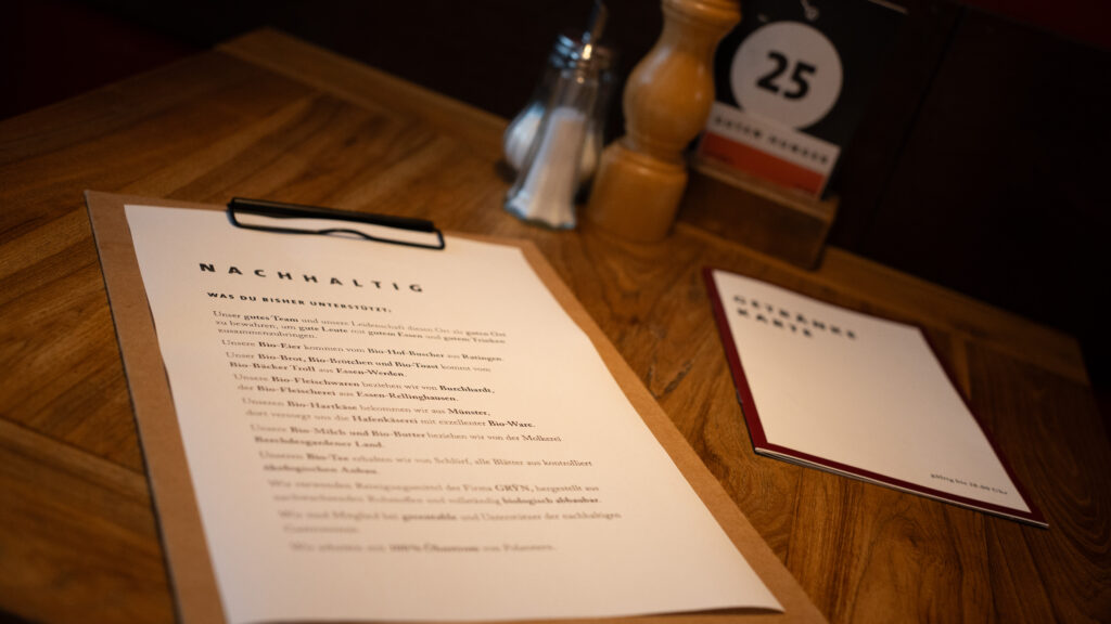 Ein zentraler Aspekt der Zweibar ist die Regionalität der Produkte. Phil und Lisa achten darauf, dass ihre Lieferanten aus der Region stammen und die Produkte nachhaltig produziert werden. Sie sind seit einigen Jahren biozertifiziert und verwenden Ökostrom sowie ökologische Reinigungsmittel. Ihre Bons werden auf Ökopapier gedruckt, und die meisten Grundprodukte wie Fleisch, Käse, Milch und Brot sind bio und regional, hauptsächlich aus Nordrhein-Westfalen.