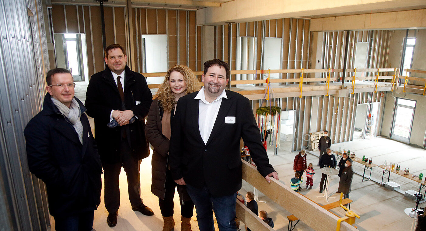 Im Februar fand am Max-Planck-Ring in Oberhausen das Richtfest für den Büro- und KiTa (Kindertagesstätte)-Neubau statt und die Räumlichkeiten konnten besichtigt werden; die Feier fand Corona-bedingt im kleineren Rahmen statt. Im Bild: Richtfest mit Thorsten Prauser, Oberbürgermeister Daniel Schranz und Investorenpaar Sonja und Nils Gehring.