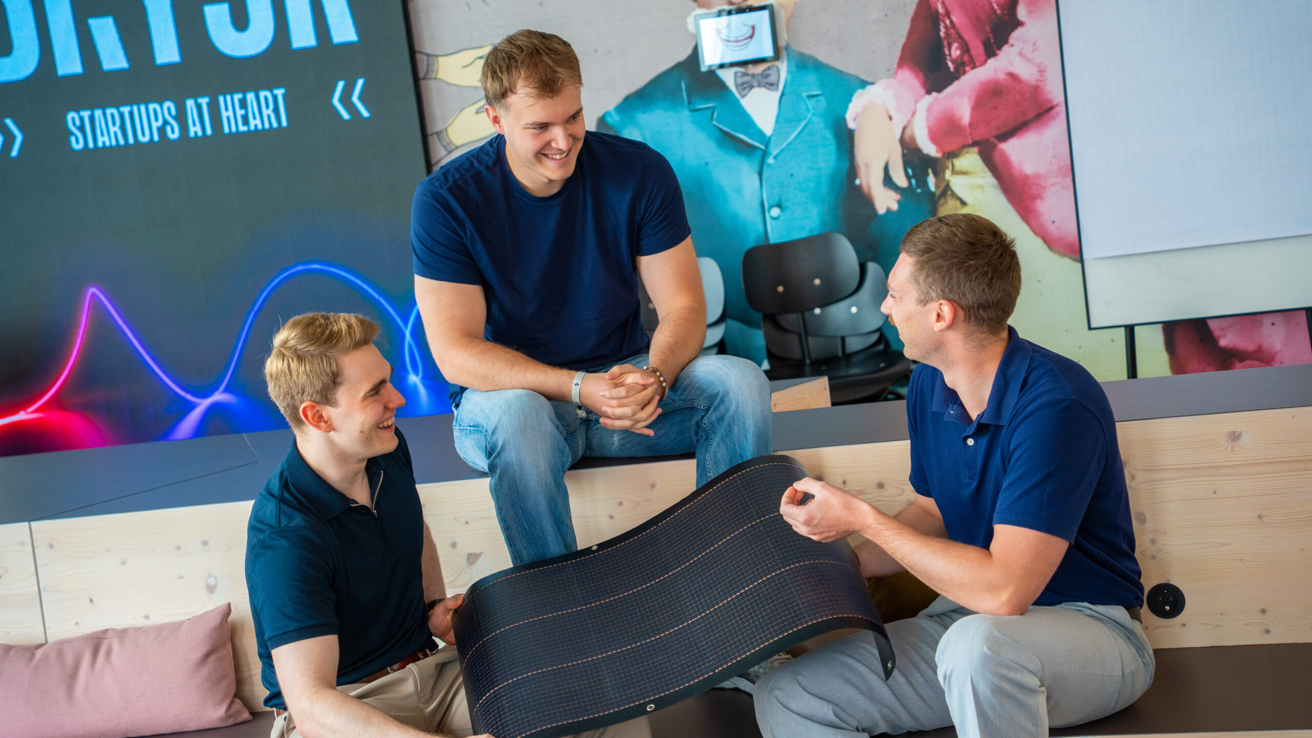 Hinter dem Start-up steht ein sechsköpfiges Team, das sich teilweise schon seit der Schulzeit am Burggymnasium in Essen kennt. Dort trafen Leonard Young Eugen Mangazeev und Lukas Albrecht im Chinesisch-Chor auf Ivan Pavlovic. Sprachkenntnisse aus dem Fach Chinesisch und Reisen nach China helfen ihnen heute bei der Zusammenarbeit mit dem Hersteller des Solarstoffs. Bei den Startup Olympics stieß Adrian Schmidt zum Team und wurde später Mitgründer. Kurz darauf kam Felix Matschilles dazu, den Eugen Mangazeev während seines Auslandssemesters in Shanghai kennenlernte. Derzeit absolviert er seinen Master in China und begleitet von dort die Produktion. „Wir ergänzen uns als Team gut, jeder hat seinen eigenen Aufgabenbereich“, sagt Eugen Mangazeev. „Im Team herrscht Harmonie, die die Zusammenarbeit besonders macht“, ergänzt Ivan Pavlovic.
