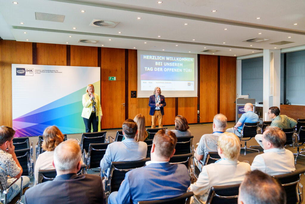 Unser erster Tag der offenen Tür begann mit einer herzlichen Begrüßung durch unsere Hauptgeschäftsführerin Kerstin Groß und unseren Präsidenten Gerd Kleemeyer. Anschließend konnten die Gäste in thematisch gestalteten Räumen, die von unseren Mitarbeitenden vorbereitet worden waren, mehr über unsere Arbeit für die regionale Wirtschaft erfahren und mit uns ins Gespräch kommen.