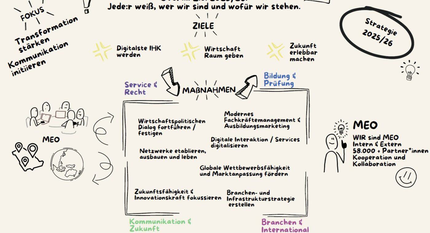 Veränderungen sind allgegenwärtig und die Wirtschaft befindet sich in einer tiefgreifenden Transformation, die neue Möglichkeiten, aber auch Herausforderungen mit sich bringt. Tagtäglich treiben Demografie, Digitalisierung, Dekarbonisierung, Diversifizierung und disruptive Innovationen unsere Mitgliedsunternehmen um. Wir als IHK sind hiervon natürlich nicht ausgenommen, sondern beschäftigen uns ebenso mit genau diesen Themen und sitzen umgangssprachlich „im selben Boot“. Nur logisch ist daher also, dass sich unsere Mitarbeitenden als Teil der MEO-Region verstehen und wir gemeinsam mit unseren Mitgliedern, Seite an Seite in die Zukunft schreiten möchten.